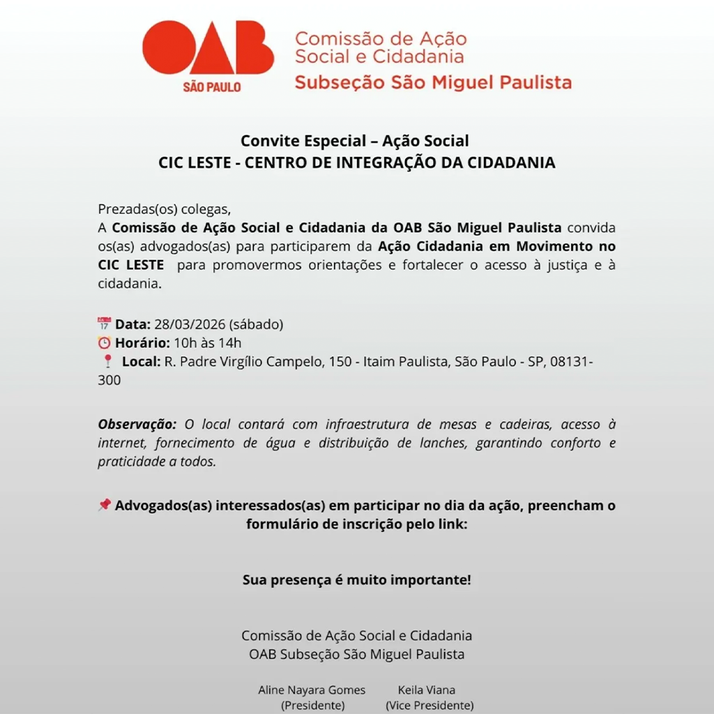 A Comissão de Ação Social e Cidadania da OAB São Miguel Paulista convida os(as) advogados(as) para participarem da Ação Cidadania em Movimento no