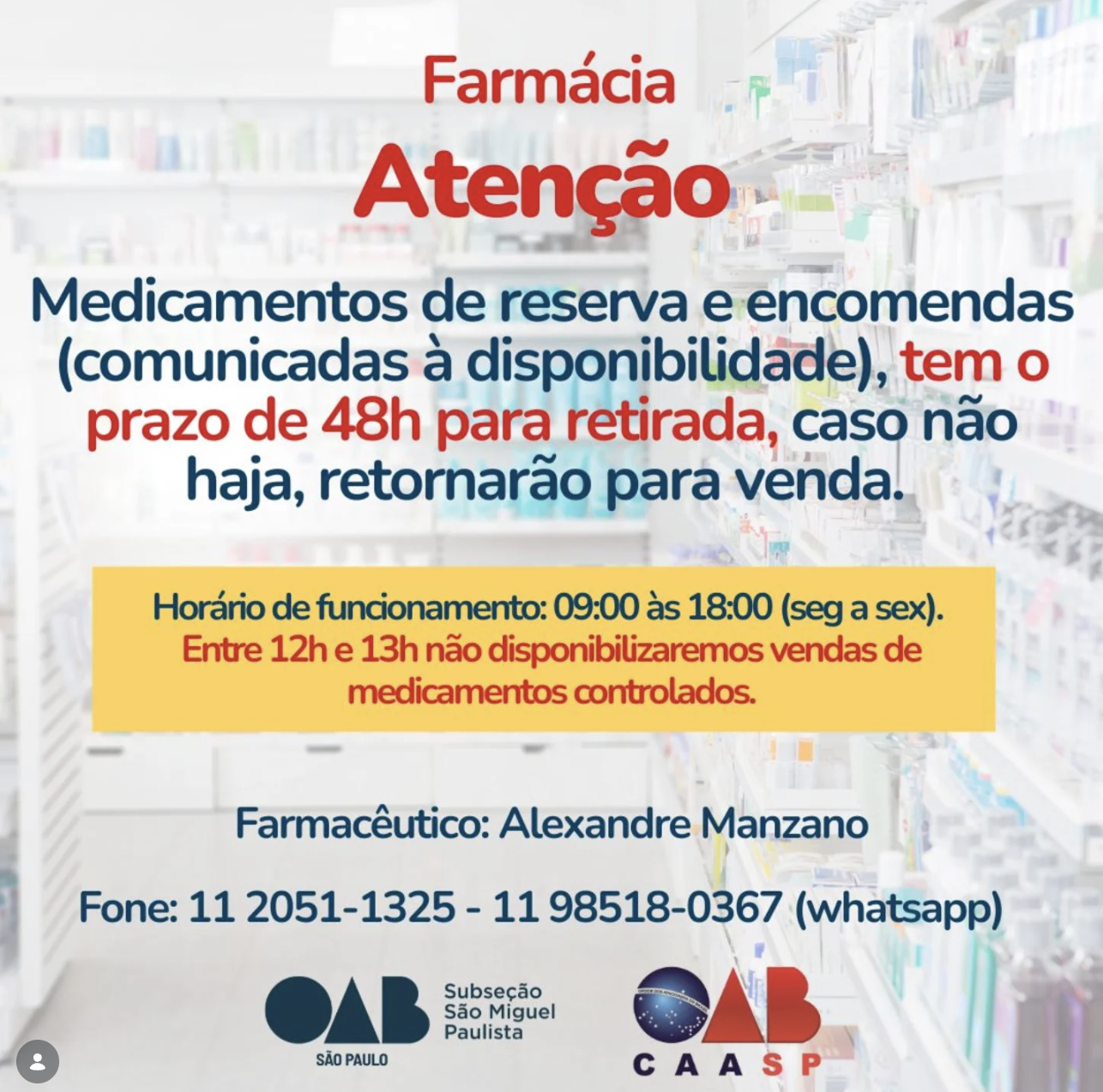 Os medicamentos reservados ou encomendados devem ser retirados em até 48 horas após a confirmação de disponibilidade. Após esse prazo, voltarão para venda.