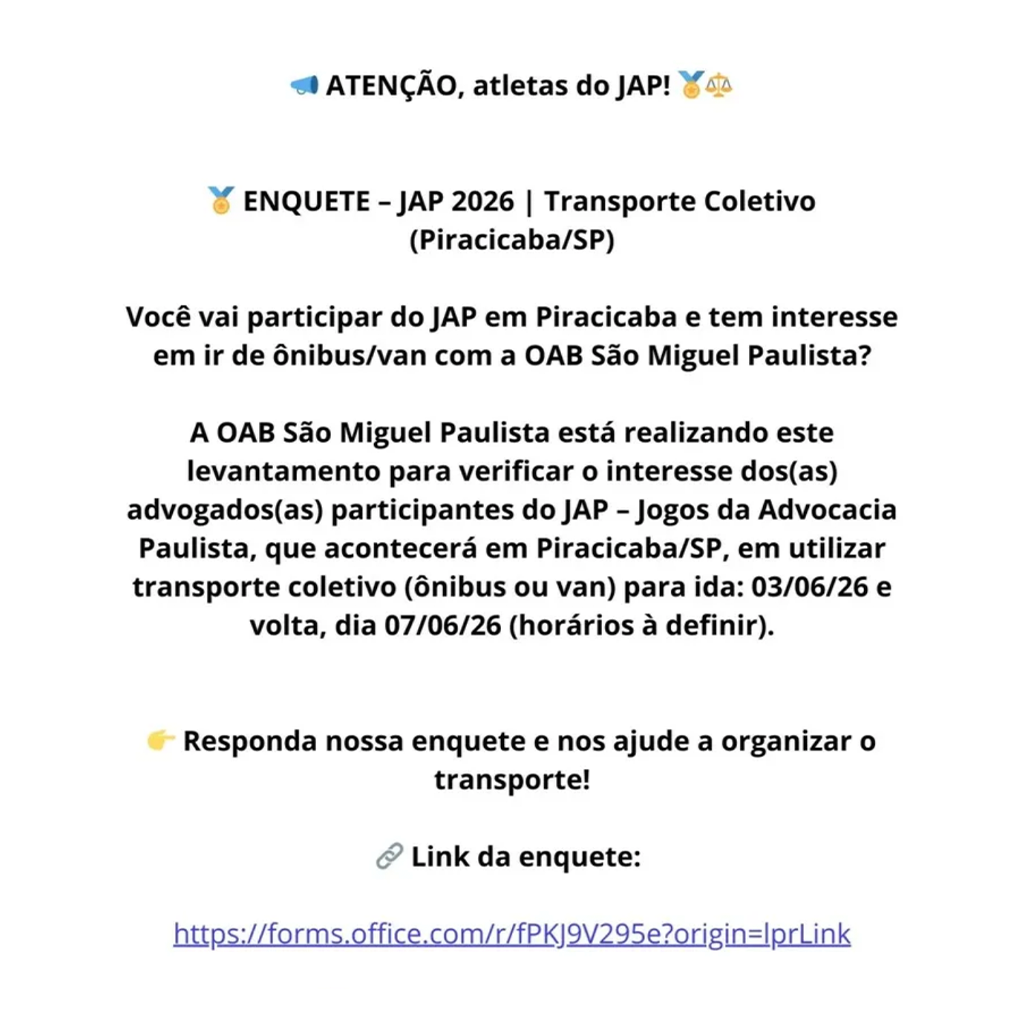 advogados(as) participantes do JAP - Jogos da Advocacia Paulista, que acontecerá em Piracicaba/SP, em utilizar transporte coletivo (ônibus ou van) para ida: 03/06/26 e volta, dia 07/06/26 (horários à definir).
